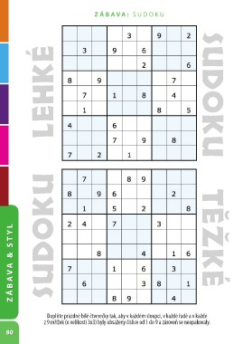 LEHKÉ z á b a v a : s u dok u SUDOKU TĚŽKÉ zzáábbaavvaa && ssttyyll Doplňte prázdné bílé čtverečky tak, aby v každém sloupci, v každé řadě a v každé z 9 mřížek (o velikosti 3x3) byly obsaženy číslice od 1 do 9 a zároveň se neopakovaly. SUDOKU 80